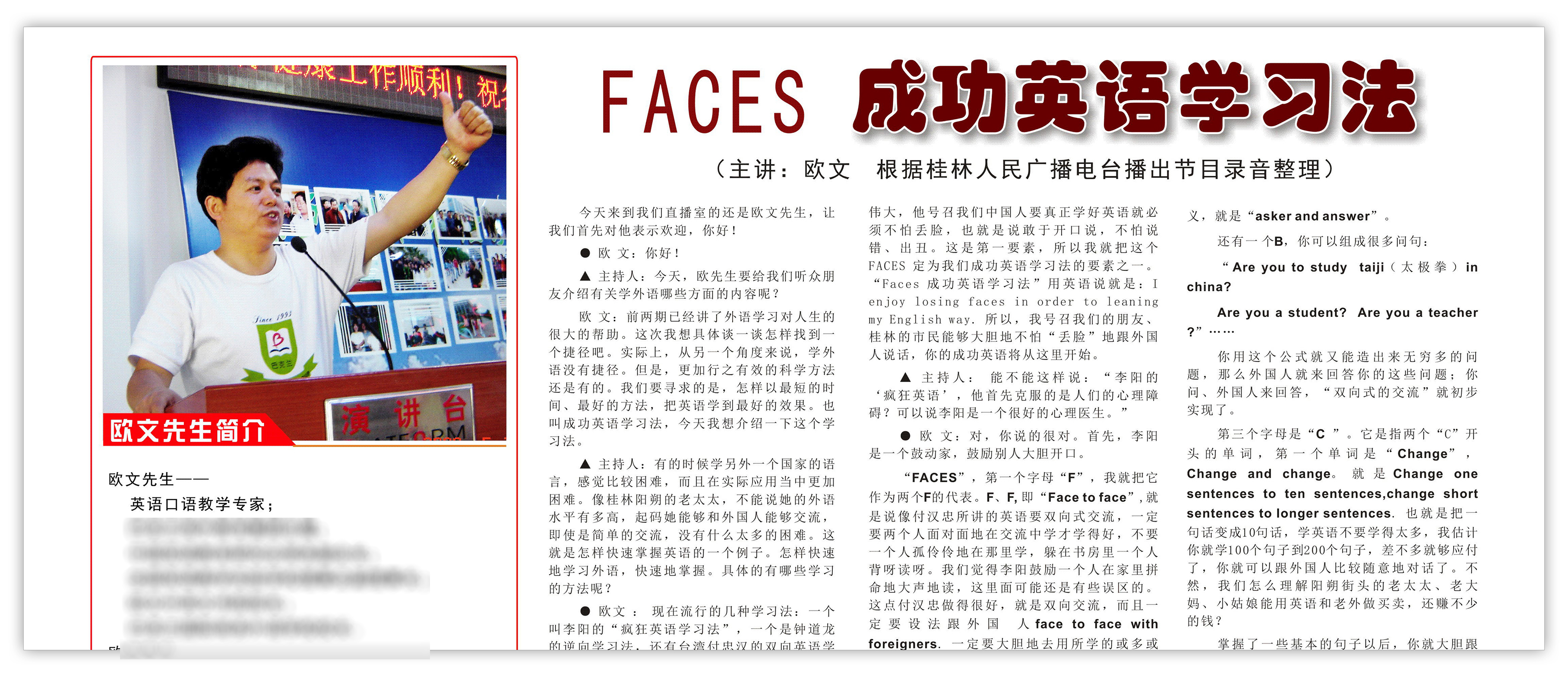 “巴克兰国际商务外语学校”和欧文的“FACES成功英语学习法”同时不胫而走。在电视尚未普及时,桂林人民广播电台找到了欧文。