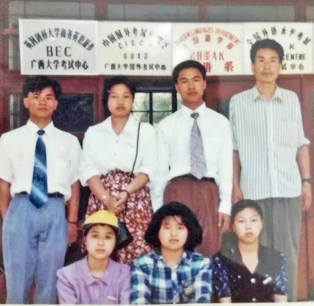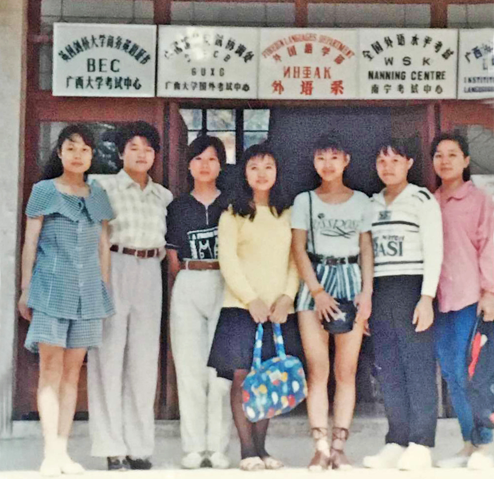 1995年,参加广西师大剑桥商务英语考试认证的巴克兰首期部分学生在考场外留影。
